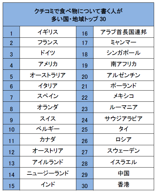 世界各国の旅行者が世界最大のオンライン宿泊予約サイトのブッキング・ドットコムに投稿した1億2,000万件以上の食に関するクチコミを国・地域別に分析した結果、1位はイギリス、そしてフランス、ドイツと続き、トップ3をヨーロッパ圏が独占した。