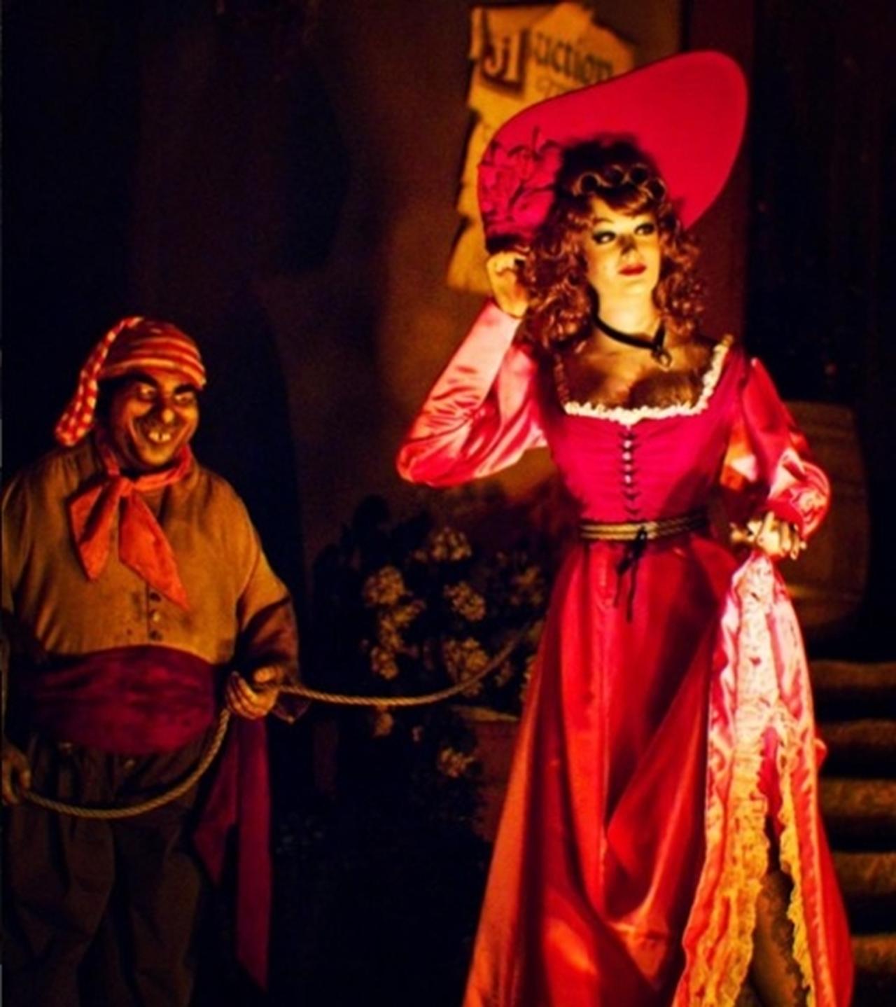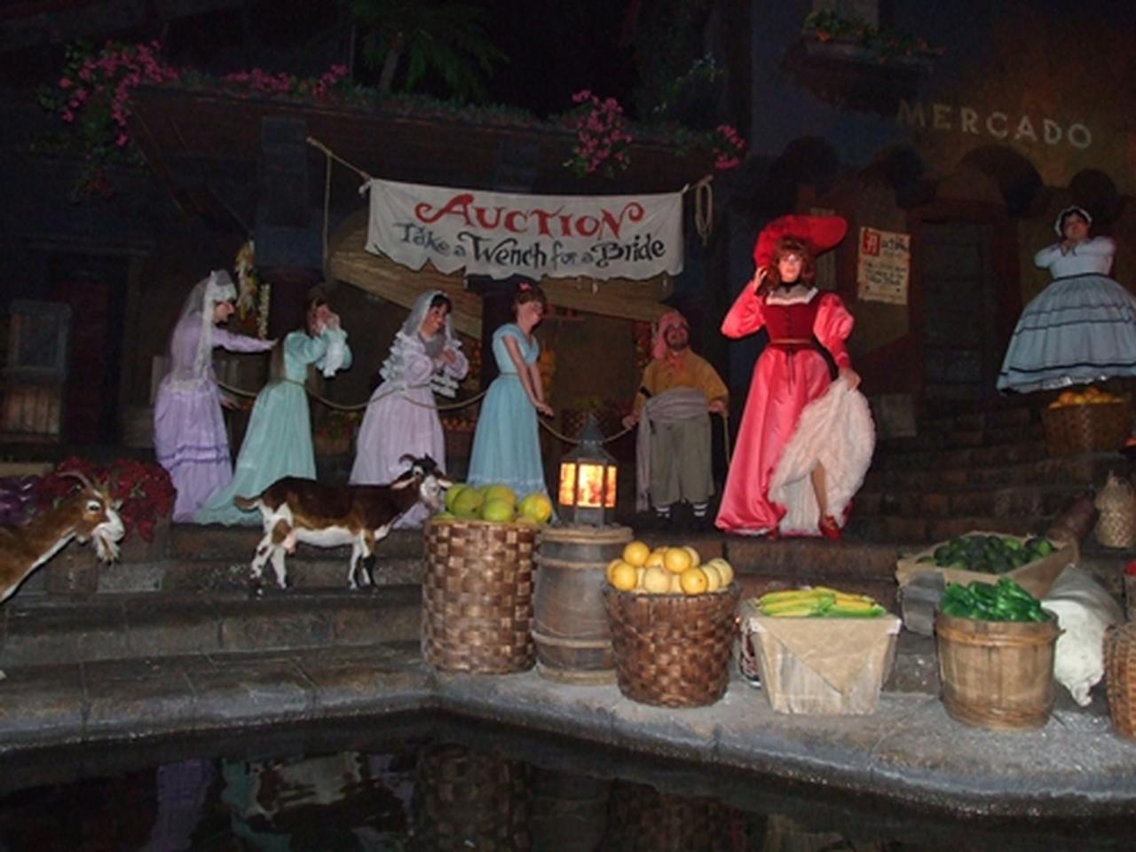 「オークション 娘を買って花嫁に」という横断幕とともに、ロープでつながれた村の女性たちが海賊を相手にオークションにかけられる同シーン。アトラクションをよく知る人にはおなじみのシーンだが、「女性を売る」という行為が以前から「性差別的だ」との批判を受けていた。