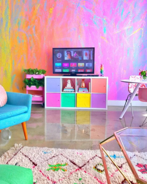 この花のウォールの向かい側にある空間には、カラフルな棚とTVが置いてある。ここで注目すべきはこの壁。アメリカの有名な画家であるジャクソン・ポロックの画にインスピレーションを受けて、カラフルに塗った壁に、違う色の絵の具を飛び散らせている。