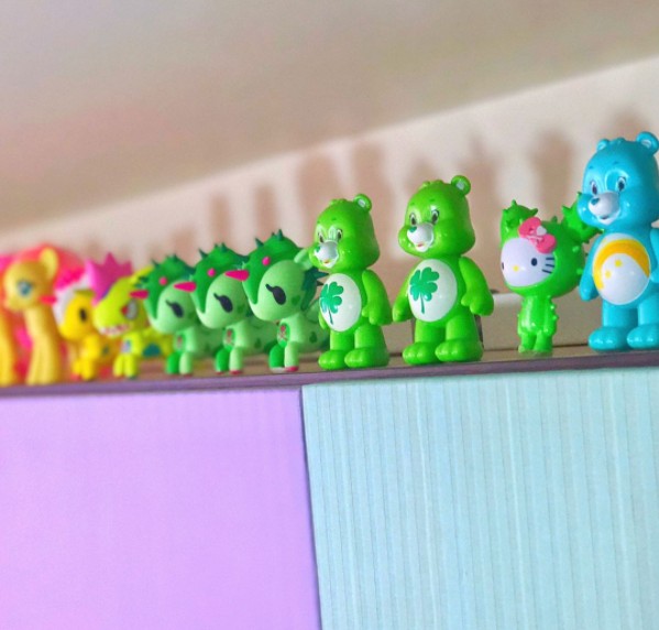 キッチンももちろんカラフルで、キャビネットのトビラを1つ1つ違う色に塗っている。キャビネットの上にはケアベアやハロー・キティなどが置いてある。