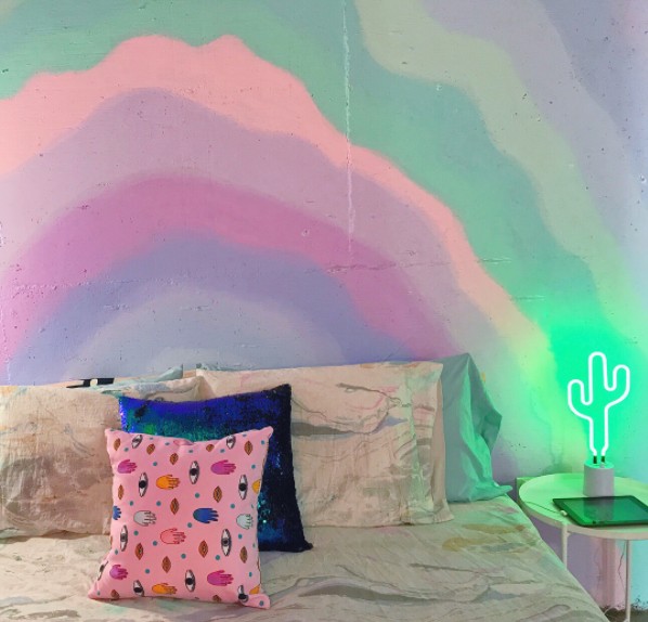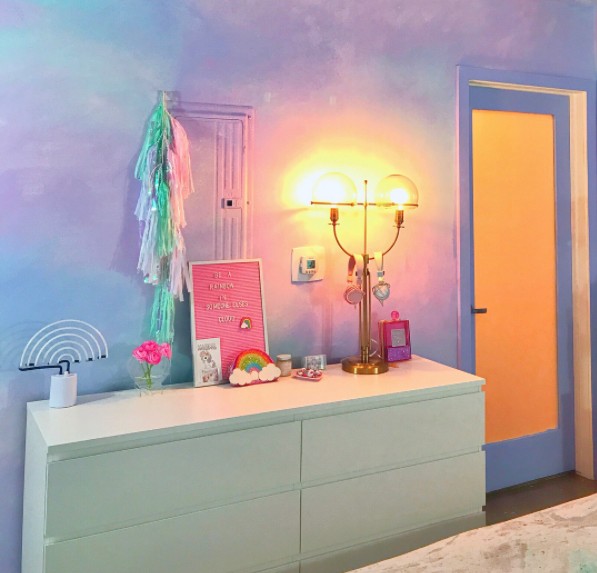 アミーナは、ユニコーンをテーマにして壁からすべてDIYで作った寝室を、アミーナは「クリスタル・ユニコーン・ケーブ」と呼んでいる。ベッドの上にパステルカラーで虹を描いており、ベッド横にはサボテンのネオンライトで、さらにオシャレな空間に。