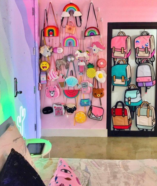 寝室の壁には、アミーナが所有するたくさんのポップなバッグがかけられている。