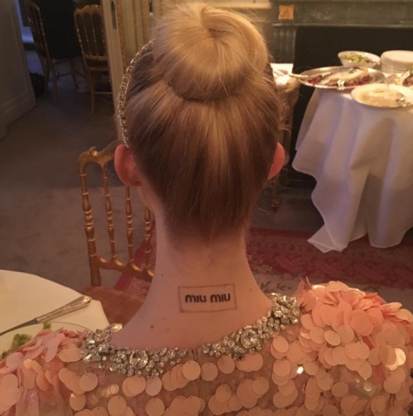 じつはこの日のエルの首の後ろには、miu miuと書かれたフェイクタトゥーが。細部まで遊び心たっぷりなアクセントをプラスしていた。