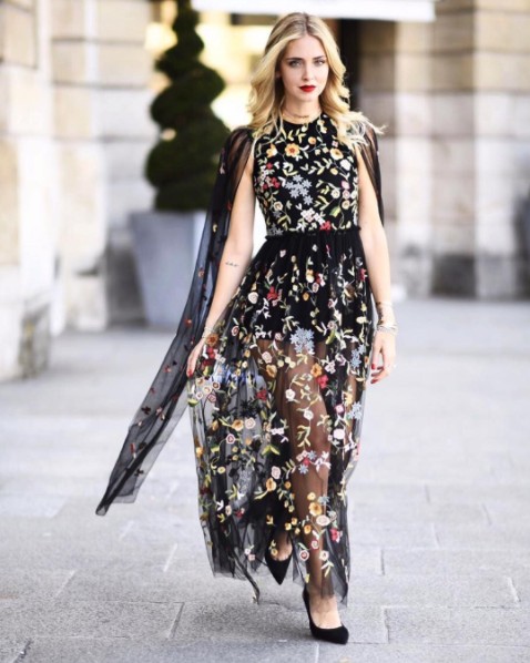 人気ブロガーのキアラは、シースルーで脚をのぞかせた花柄のエンブロイダリードレスで華やかにまとめてDiorのショーへ。肩についたローブ部分がより一層ドラマチックに演出。