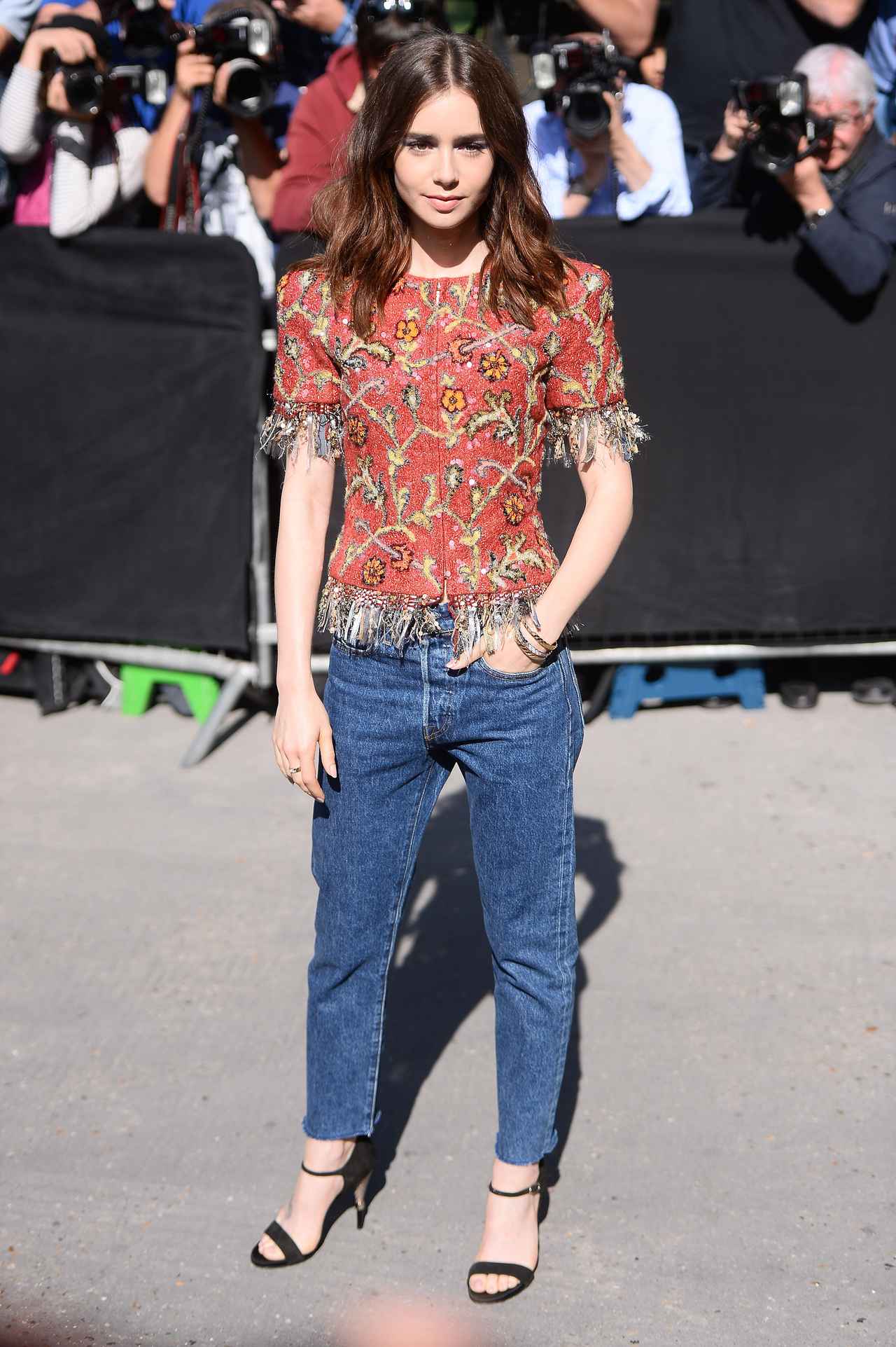 女優のリリーは、CHANELのショーにカジュアルなデニムで参戦。腰あたりからゆったりとしたシルエットのマムジーンズを、CHANEL2017プレフォールから煌びやかなビジューが装飾された花柄トップスでゴージャスに昇華。