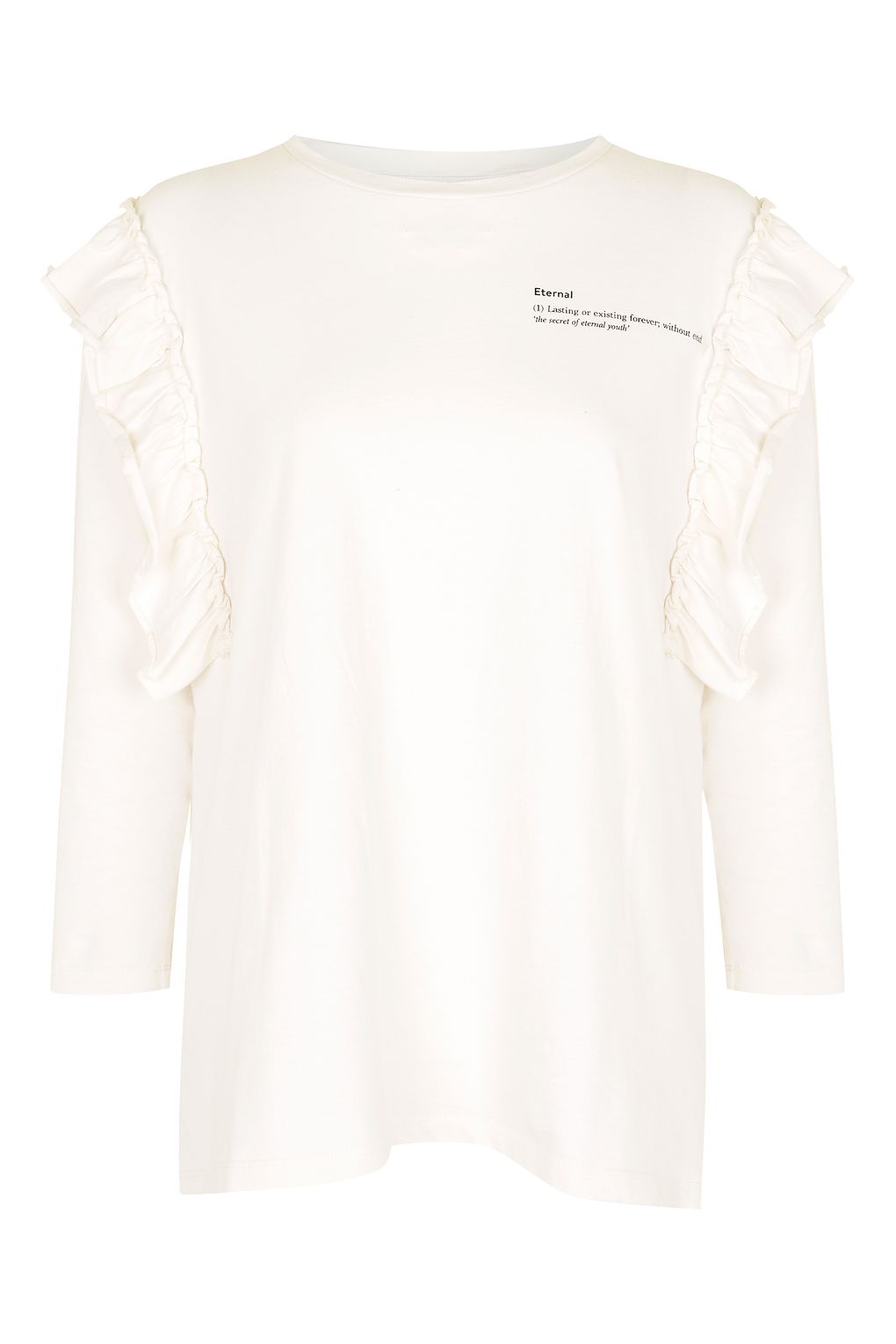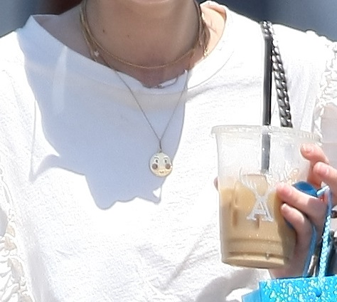 LAでお出かけ中にカフェに寄ったルーシーは、トレンド感のある肩にラッフルのディテールが付いた白トップスを、ハイウエストのデニムショートパンツにインし、休日らしいカジュアルスタイルに。