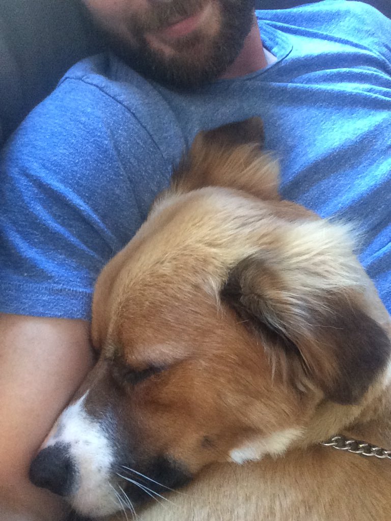 クリスが自身のツイッターで、先日シェルターで保護したばかりの愛犬ドジャーが、クリスの胸元で寝ている写真を投稿。