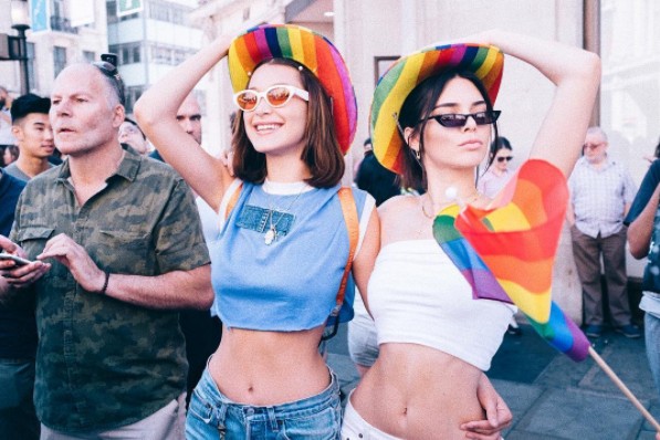 親友同士のモデルのベラ・ハディッドとケンダル・ジェンナーは、ロンドンで行われたLGBTのパレードにおそろいのレインボーハットを被って登場。