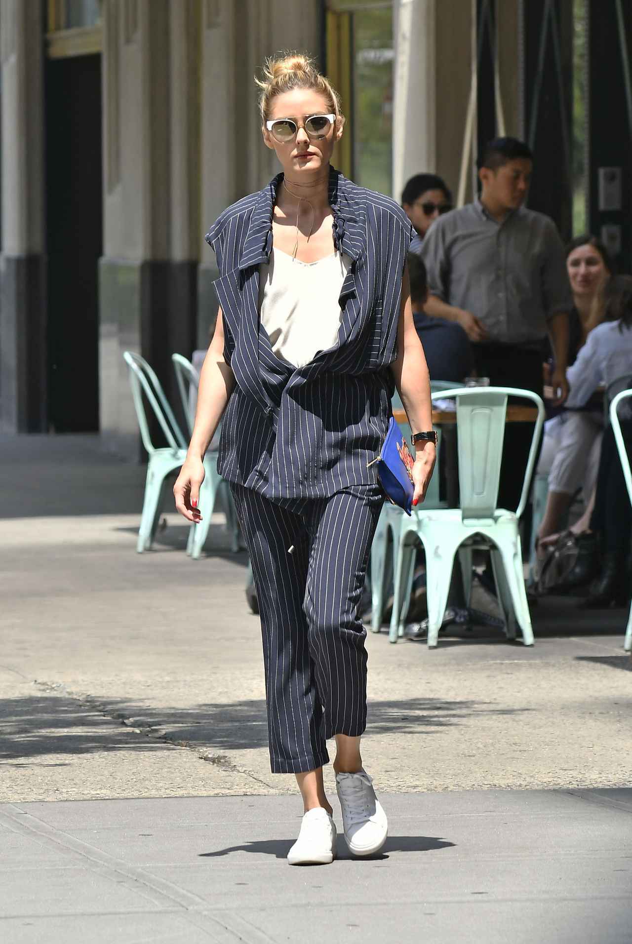 ピンストライプのベストとクロップト丈パンツのセットアップスタイルに、KENNETH COLEの白スニーカーで爽やかに。DIANE VON FURSTENBERGのクラッチとMax&Co.のキャットアイサングラスでアクセントを。