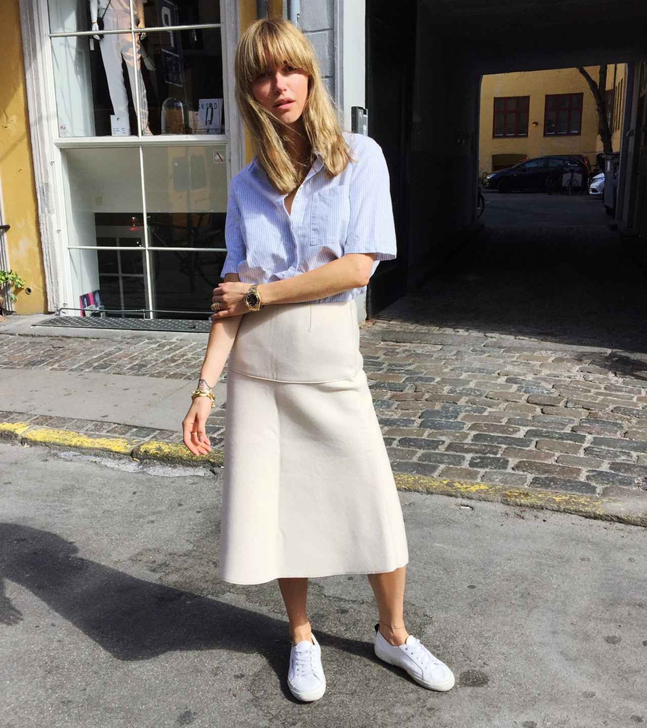 夏らしさを感じるストライプシャツには、BY MALENE BIRGERのミディ丈スカートでフェミニンな要素を盛り込んで。SUPERGAの白スニーカーでラフに落とし込んだのが正解。
