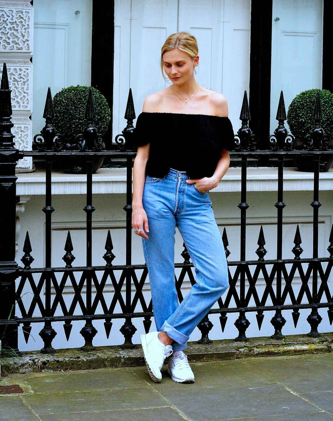 ラッフル付きのラヴリーなTOPSHOPのオフショルダートップスを、ゆるいストレートデニムとReebokのクラシックな白スニーカーでカジュアルダウン。