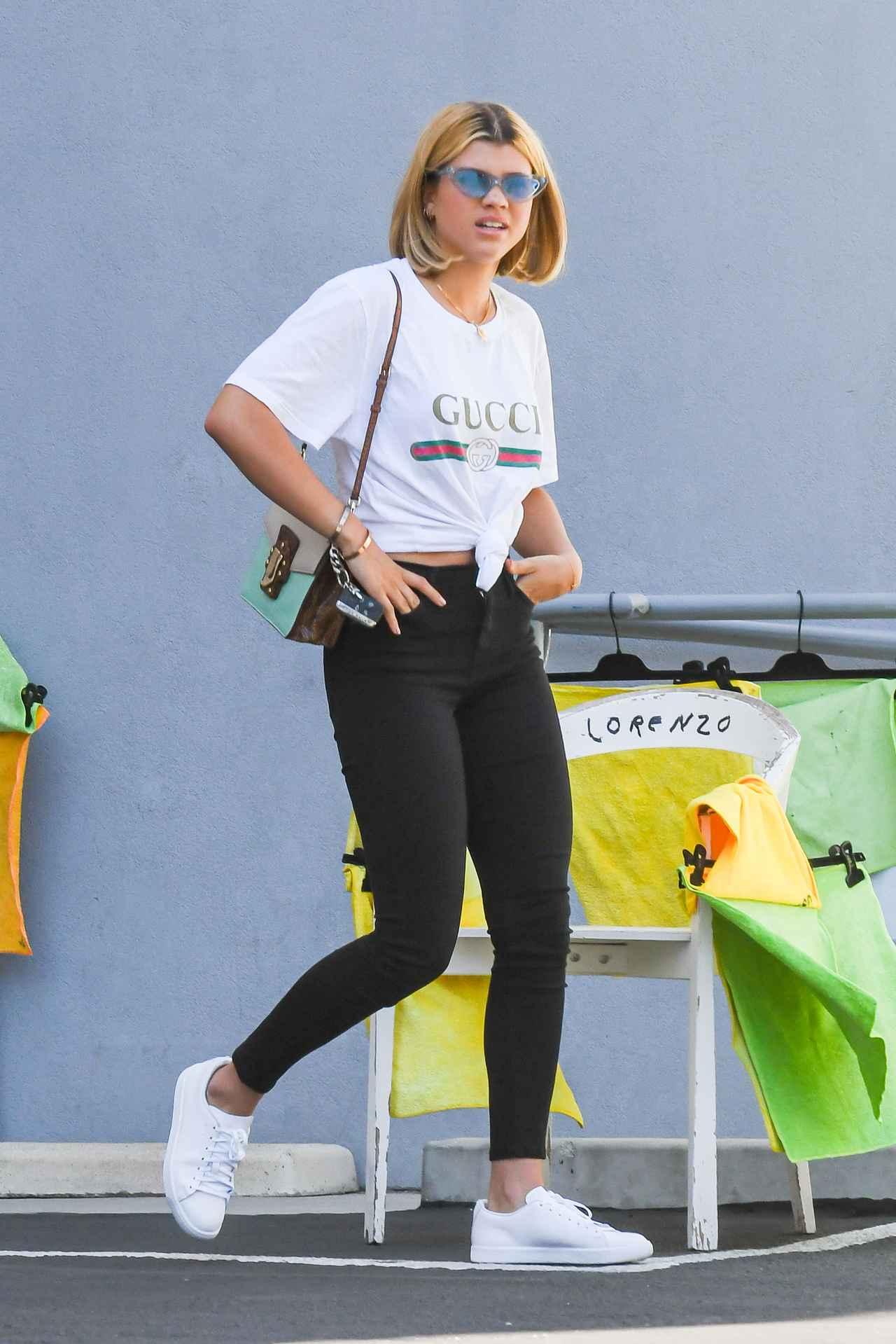 セレブの間で人気のGUCCIのロゴTシャツの裾を結び、TOPSHOPのハイウエストデニムでスタイルアップを狙ったソフィア。PUMAの白スニーカーでとことんカジュアルにまとめて。