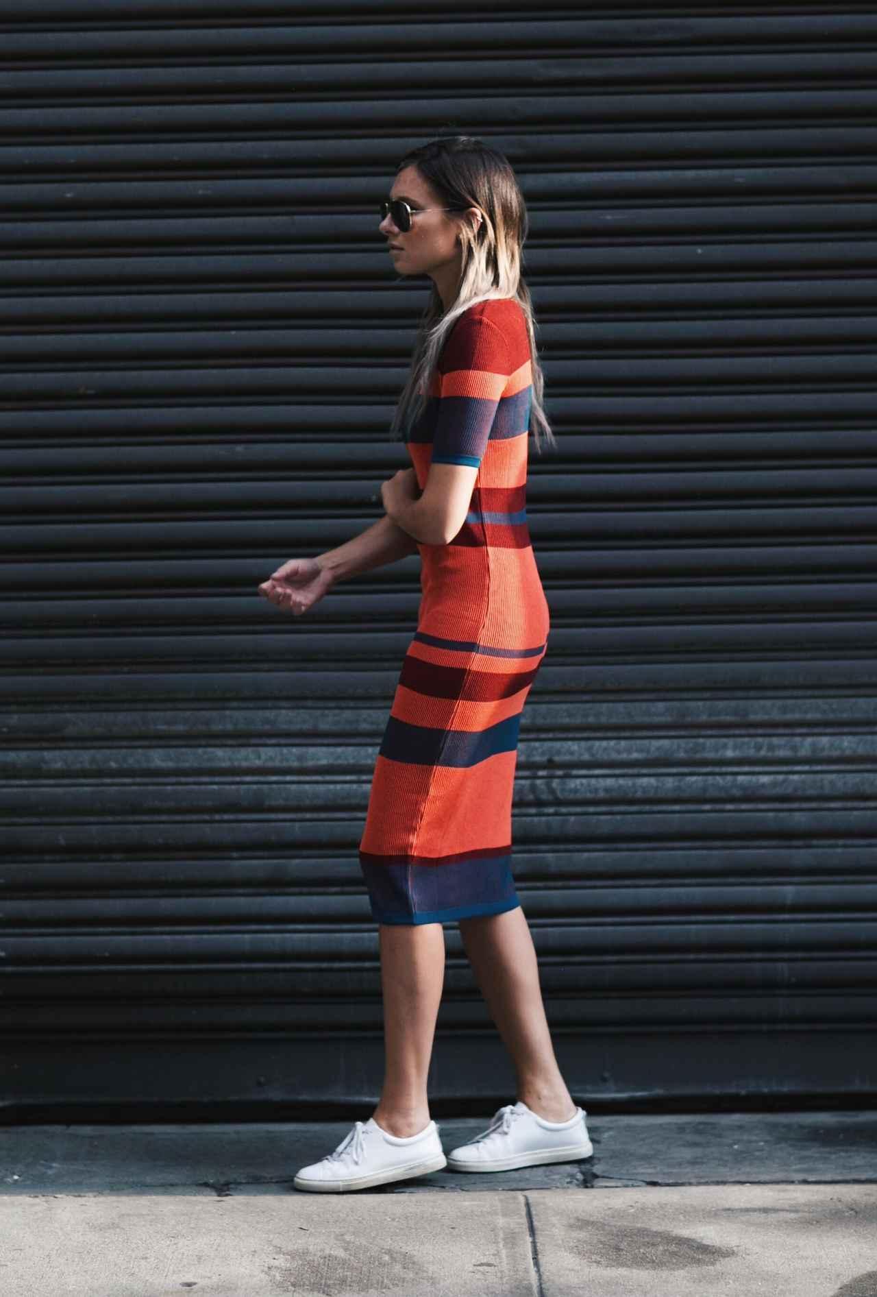 マルチカラーのストライプ柄ニットワンピースは、COMMON PROJECTSの白スニーカーをアクセントとして投入してクリーンな印象に。