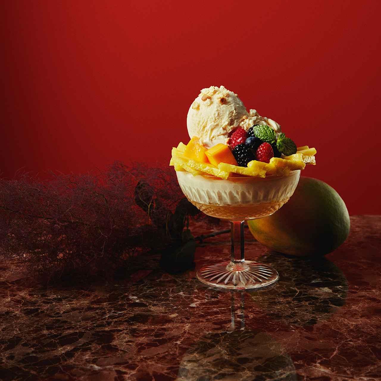 芳醇なバニラアイスクリームを削り出したふわふわな食感のハーゲンシェイブに、マンゴーやパイナップルなど風味豊かな夏のフルーツとココナッツクッキーを添えて。甘酸っぱいオレンジゼリーの爽やかな味わいがアクセントに。
