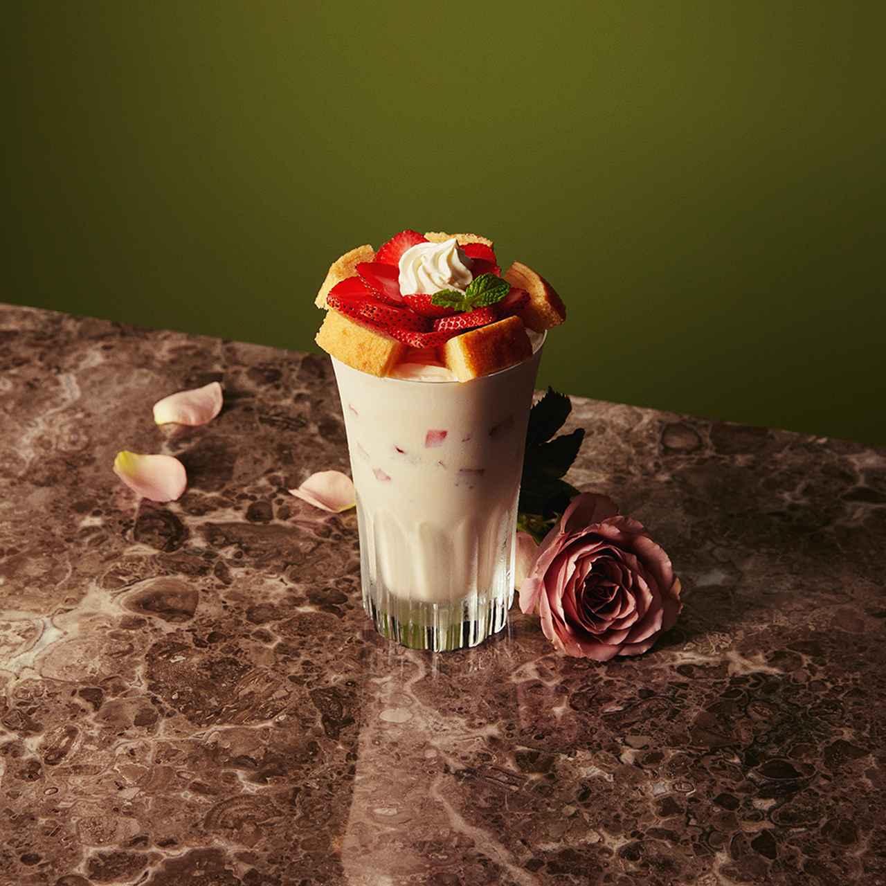濃厚なバニラアイスクリームシェイクにストロベリーをふんだんにのせて。見た目も味わいもまるでショートケーキのようなバニラシェイク。