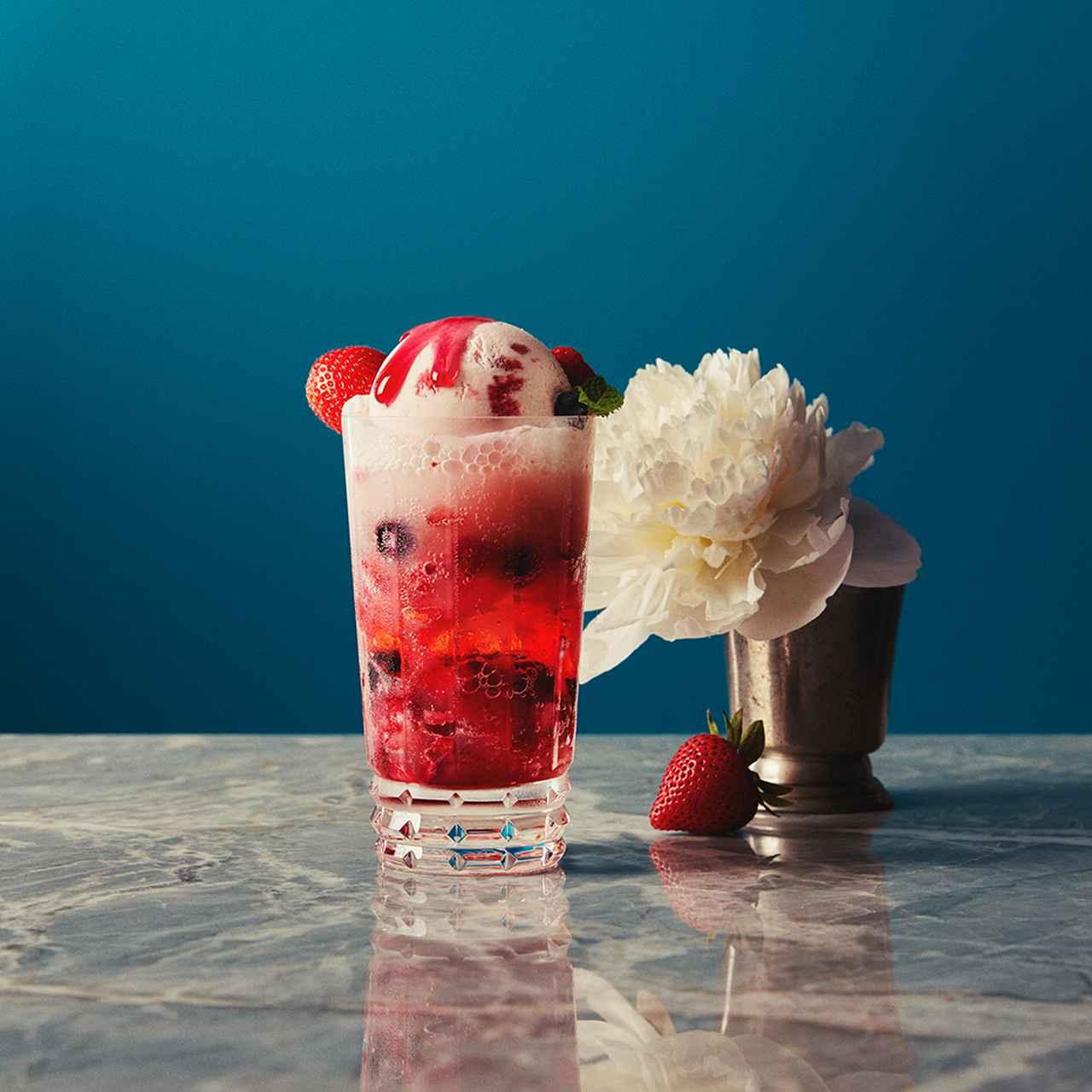 ベリー尽くしのフルーティーなフロート。果実をまるごと凍らせたミックスベリーとストロベリーアイスキューブを加えたソーダに、甘酸っぱい味わいのストロベリーアイスクリームを浮かべて。