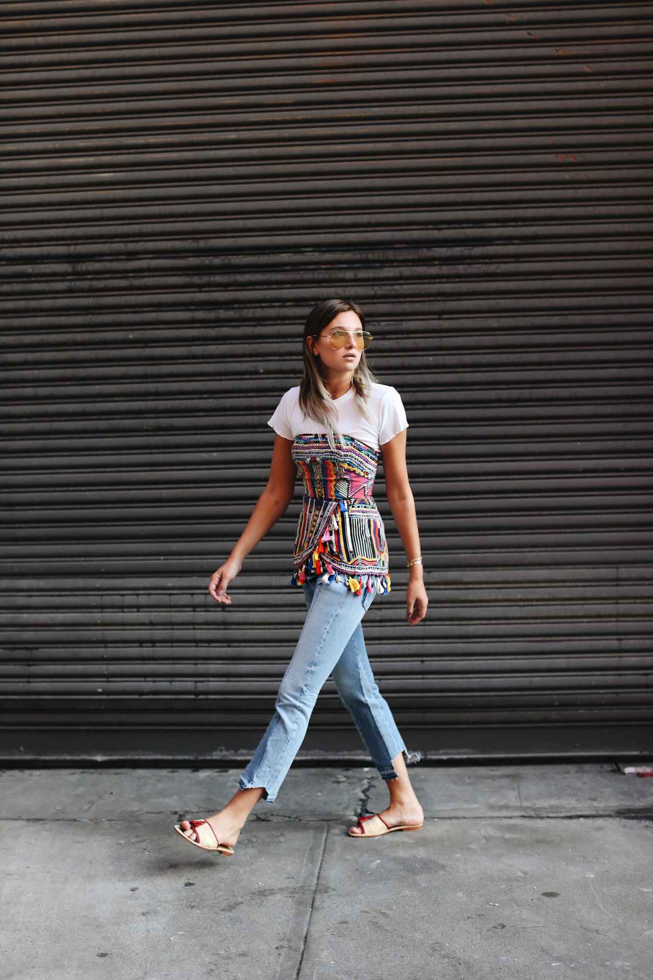 白Tシャツに、チューブトップのカラフルなフリンジが付いたトップスをレイヤーしたデコラティブなスタイルには、足元もフリンジ付きのスライドサンダルで技あり。