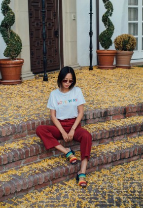 「LOVE WINS(愛は勝つ)」とレインボーカラーで書かれたロゴTシャツに合わせて、Alice and Oliviaのレインボーカラーのミュールを投入し、粋なカラースタイリングに。
