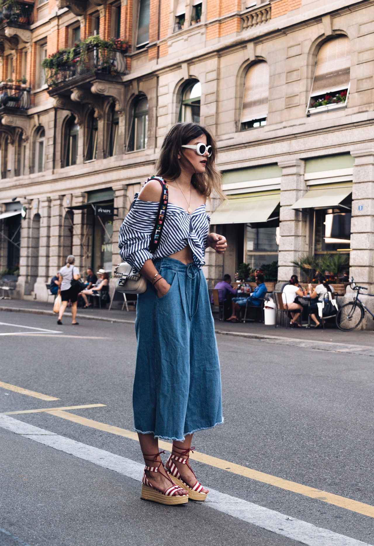 肩部分が開いたストライプシャツをオフショルダー風に着て、ヴィンテージライクなワイドデニムで最旬シルエットを狙って。SONIA RYKIELの赤のストライプ柄のレースアップサンダルでレディに。