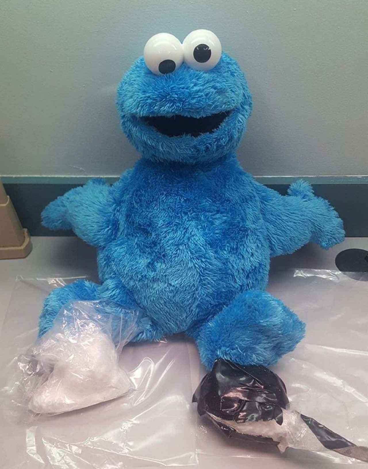 クッキーモンスターを抱き上げたところ妙に重かったため中身を確認したところ、中から2つのパックに別れたコカインが発見され、車内にいた男は逮捕された。
