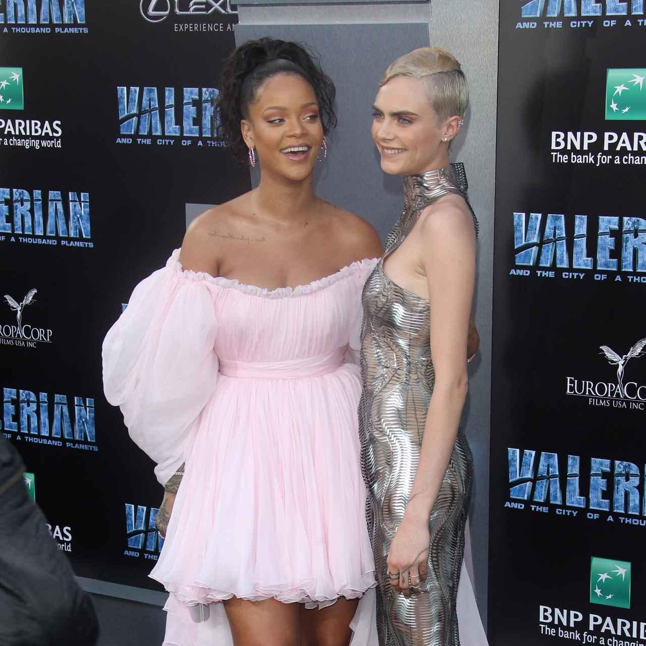 プレミアには、映画にダンサーのバブル役で出演しているシンガーのリアーナの姿も。ピンクのチュールドレスで、カーラとは全く違うロマンティックなムードで存在感を放っていたリアーナ。プライベートでも交流のある2人の豪華なショットも。