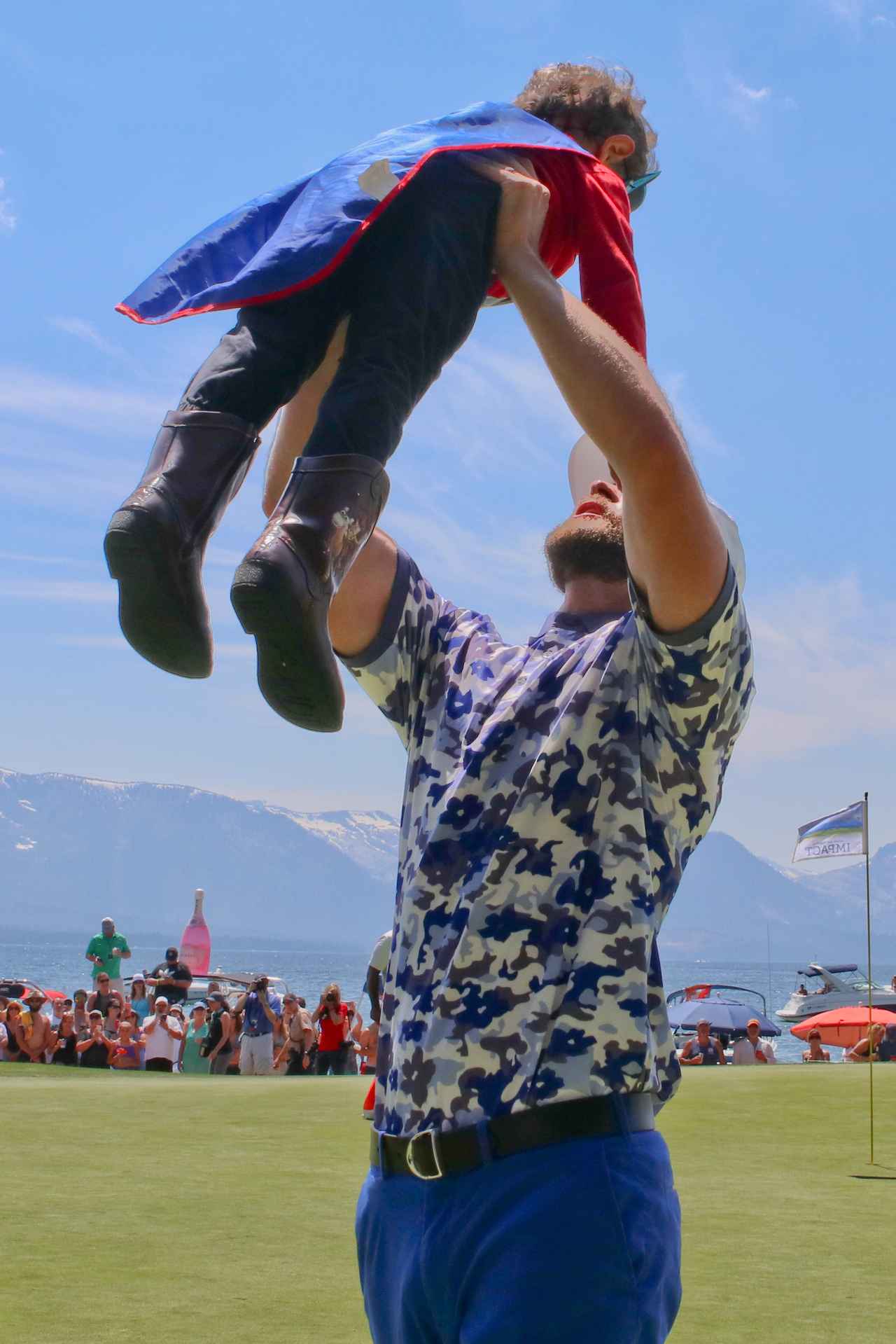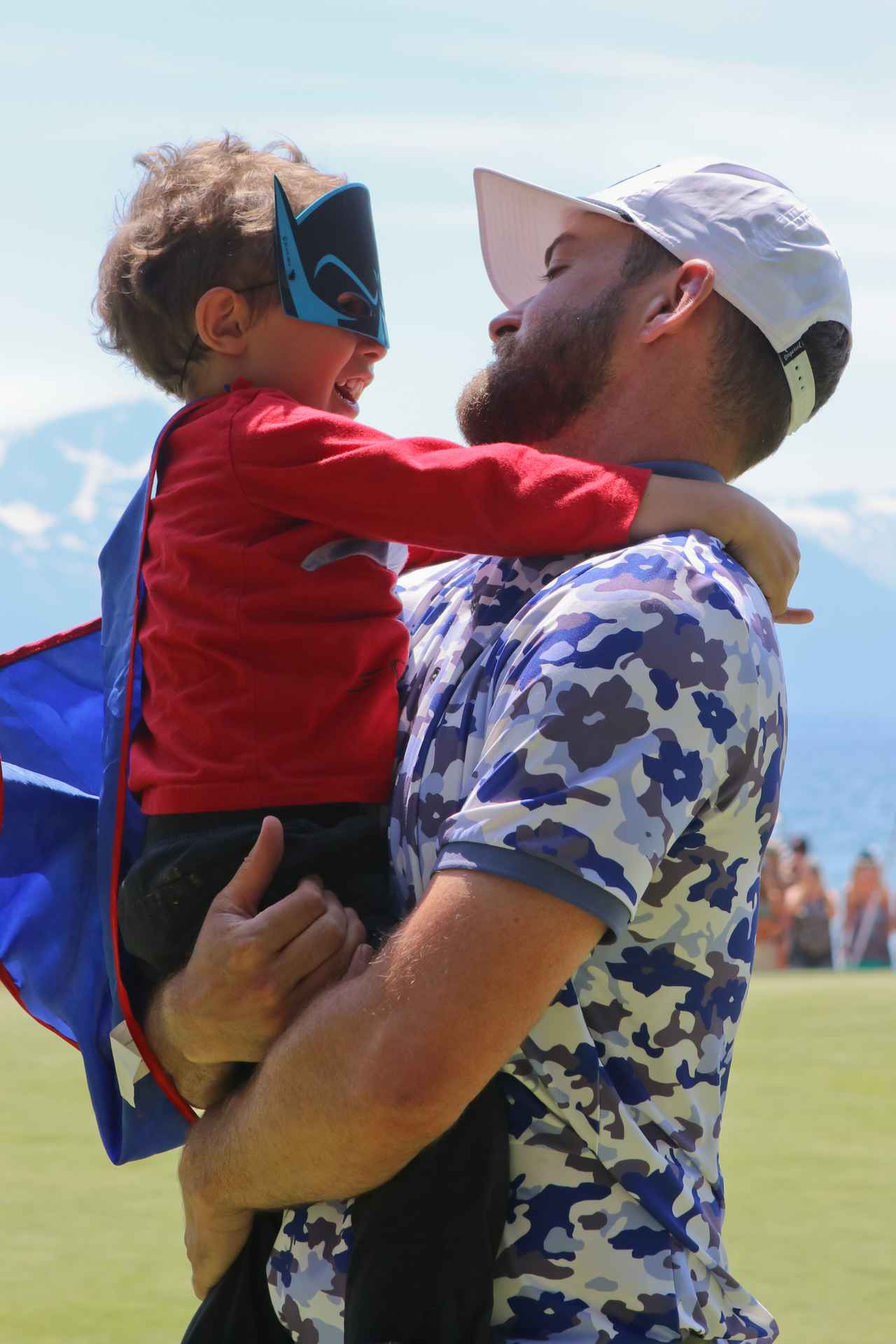 17ホールを回っていたときに現れたバッドマンのコスプレをした少年。ジャスティンは抱き上げて高い高い。