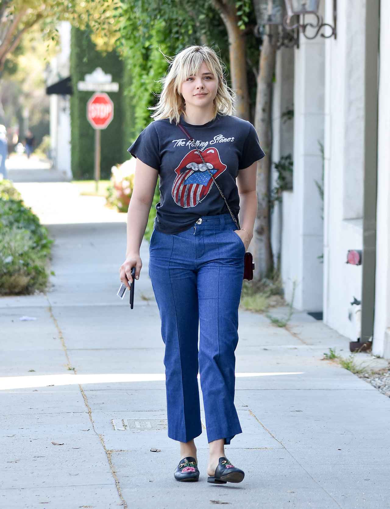 ザ・ローリング・ストーンズのバンドTシャツをクロップト丈デニムにインしてカジュアルにまとめて。セレブの間で被り率の高いGUCCIのバックレスシューズでトレンド感も忘れずに。