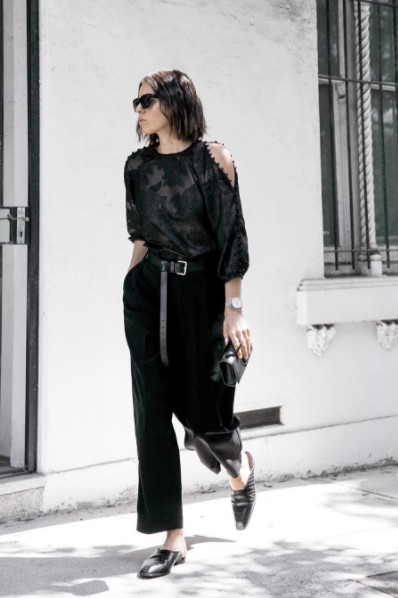 MM6のパンツにはKAREN MILLENのシースルートップスで重くなりすぎないオールブラックコーディネートに。STELLA McCARTNEYのバックレスシューズで抜け感を出してフィニッシュ。