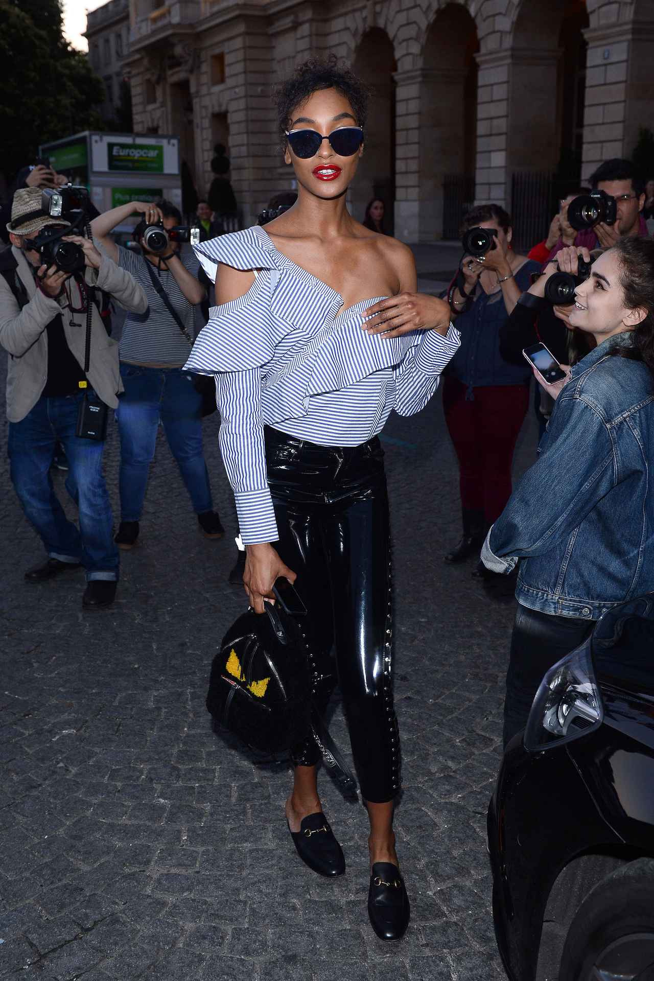 ラッフルが付いたアシンメトリーなトップスを、エッジーなレースアップのレザーパンツにインした甘辛スタイル。GUCCIのバックレスシューズが丁度いい脱力感に。バックパックはFENDI。