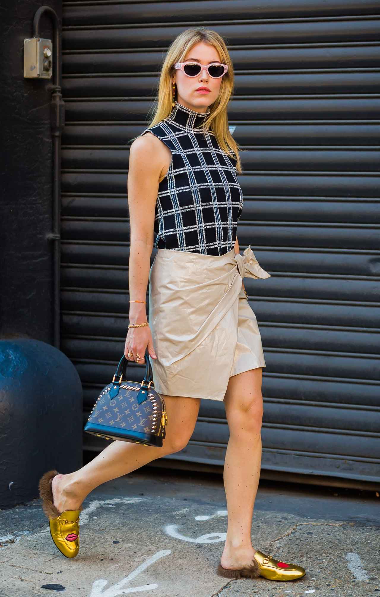 タートルネックのチェック柄ノースリーブでグットガール風に仕上げたスタイルには、GUCCIのファーが付いたゴールドカラーのバックレスシューズでエッジーにシフト。
