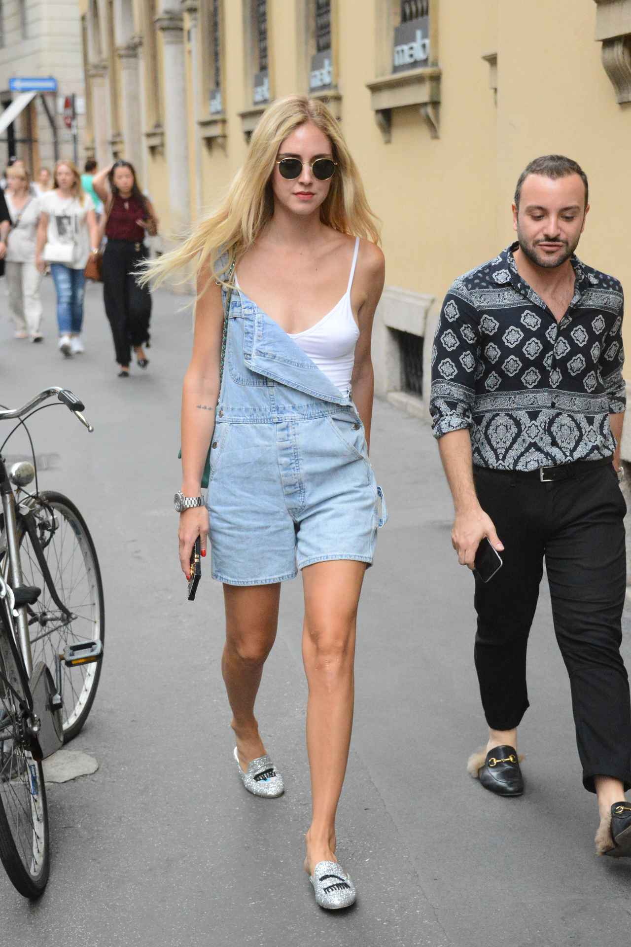 子供っぽくなりがちなデニムサロペットのストラップを片方落として着崩し、自身のブランドCHIARA FERRAGNIのグリッターサンダルでグラムな要素をプラス。