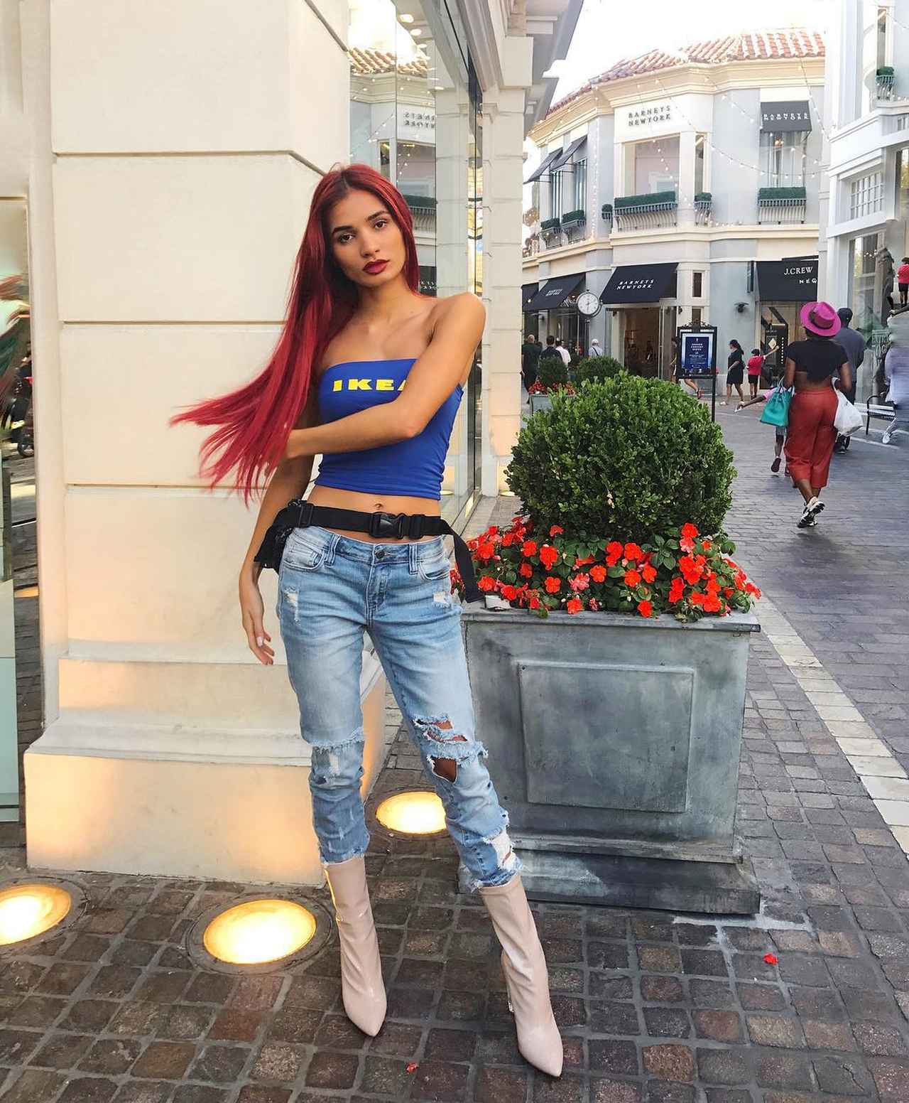 ピアは、このIKEAのロゴ入りチューブトップを、ダメージデニムとブーツにセットし、ストリート風に。