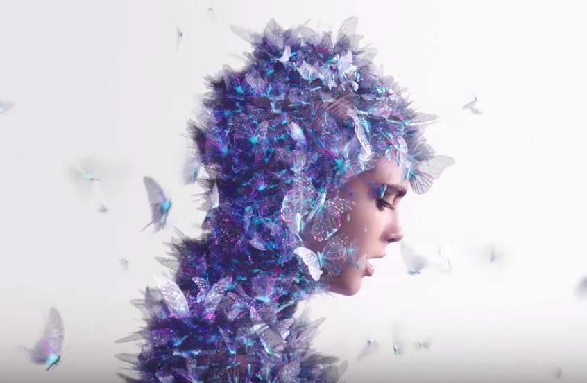 なんと映像の中盤では、CG合成により実現した、無数の紫色の蝶々が全身を覆う「全身蝶々スーツ」姿に変身!