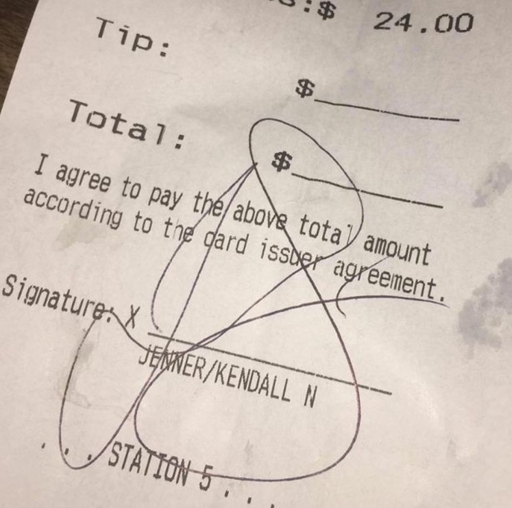 ある日ニューヨーク・ブルックリンにあるバー「ベイビーズ・オーライト」を訪れたケンダル。 その後、お店側が公式インスタグラムに、ケンダルの24ドルのレシートの写真をアップ。そこには、チップの欄には何も書かれておらず、ケンダルのサインのみが書かれている。