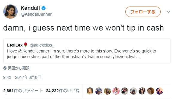 その後ケンダルが、あるファンが「背景にはもっと何かあったはず」と庇うツイートをリツイートして、「次からは現金でチップしないことにする」コメントした。