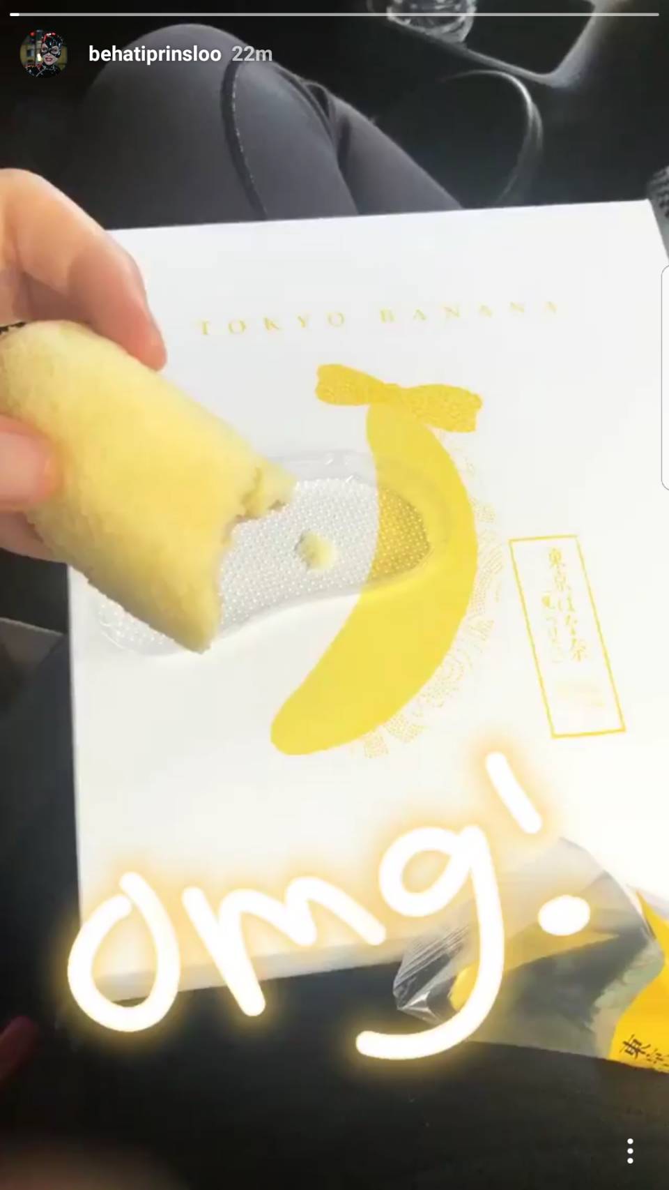 東京ばな奈「見ぃつけたっ」を車の中で食べたベハティ、そのおいしさに感動し思わず「omg(オーマイゴット)」。