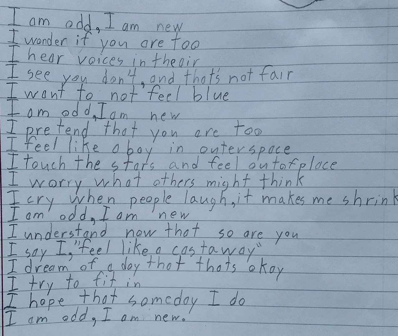 10歳の自閉症を抱える少年が、学校の課題で「私は」で始まるポエムを書いたところ、その心の内を上手く表現した内容に注目が集まっている。