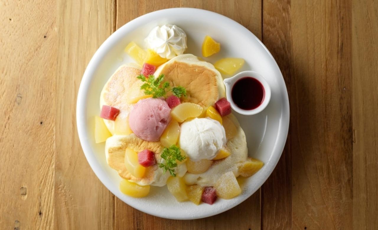 瑞々しくてジューシーなフレッシュの白桃をたっぷり、美味しさを凝縮した桃のアイスとレアチーズケーキをイメージしたアイスを組み合わせたパンケーキ「まるごと白桃レアチーズ」がドレモルタオに新登場。