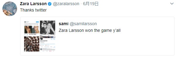 ファン:ザラ・ラーソンは(ツイッターで恋を見つけるという)ゲームにおいて勝ったよ