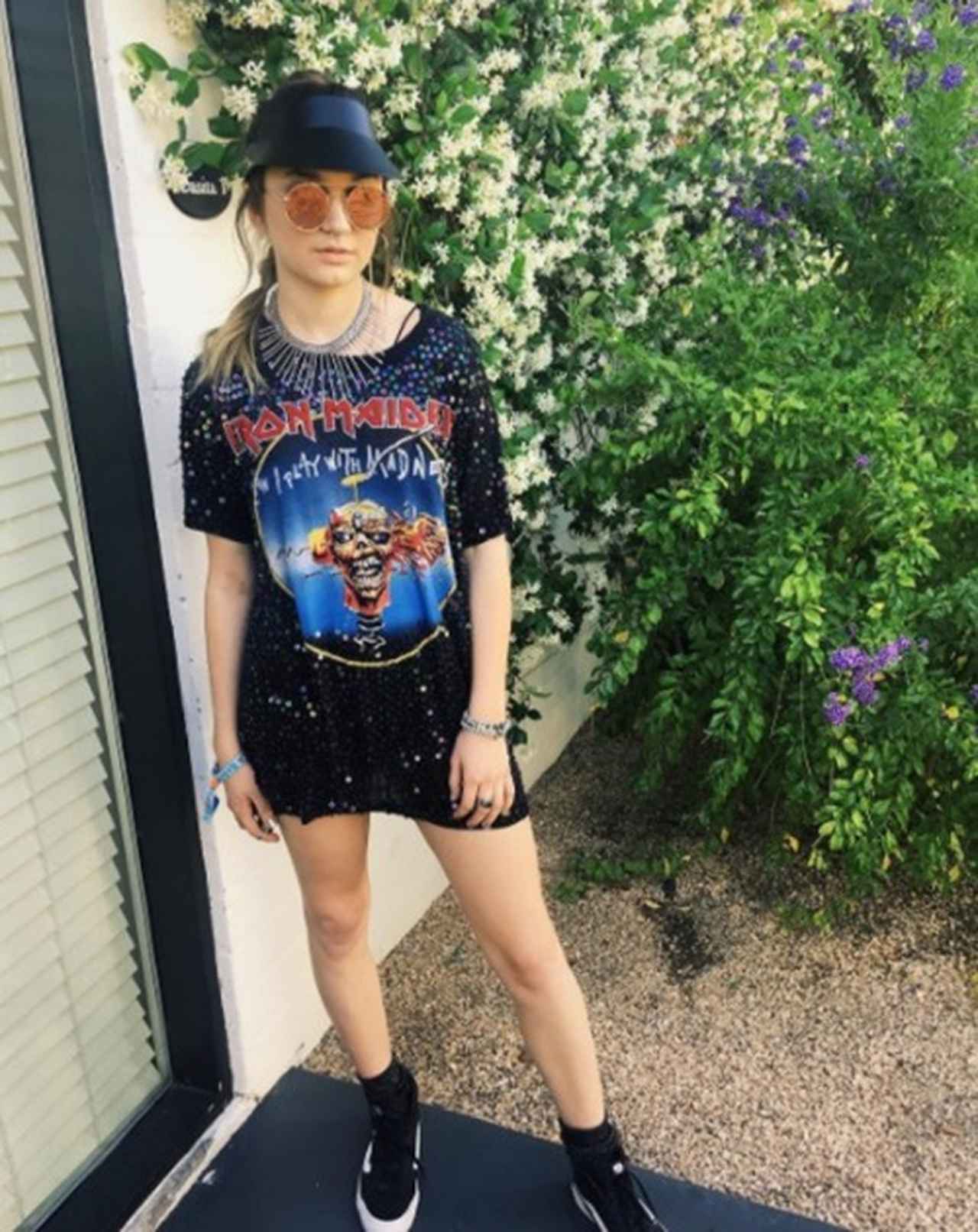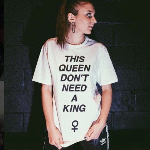 「私というクイーンに王は不要」という、「シット・スティル、ルック・プリティ」のリリックがプリントされたTシャツを着て