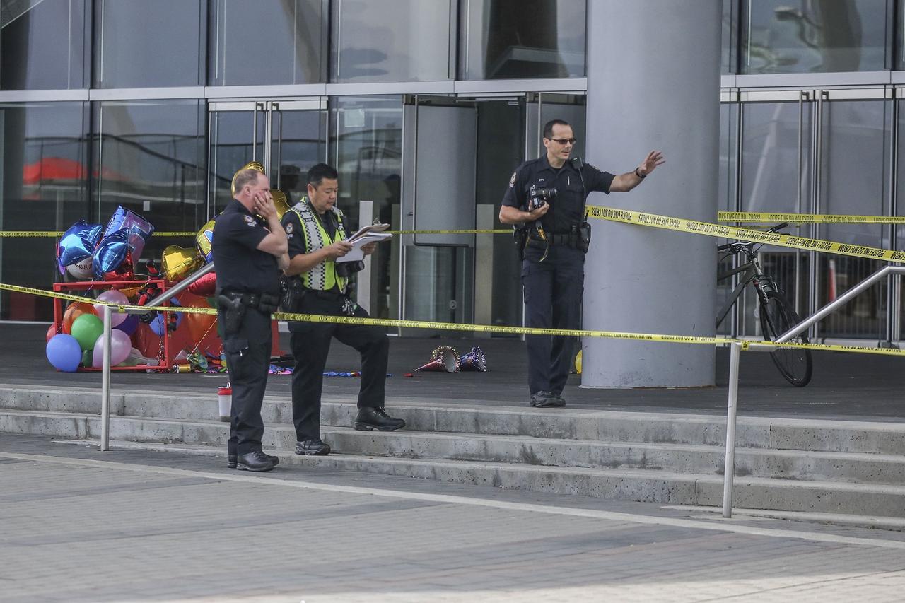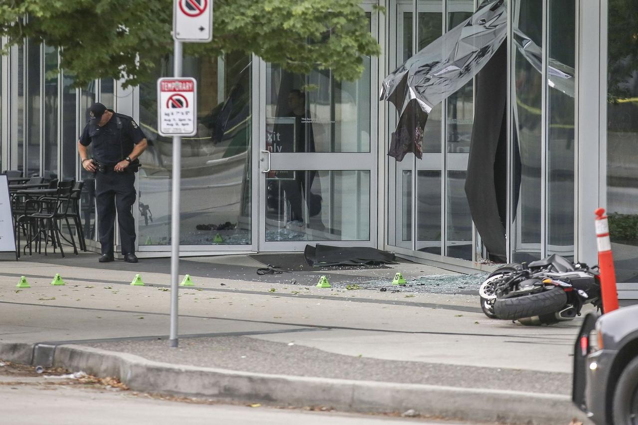 女性が乗ったバイクは、バンクーバー市内にあるオフィスビル、ショウ・タワーに激突。1階のガラスを突き破った。女性は駆けつけた救急隊員により病院には運ばれたものの息を引き取ったという。