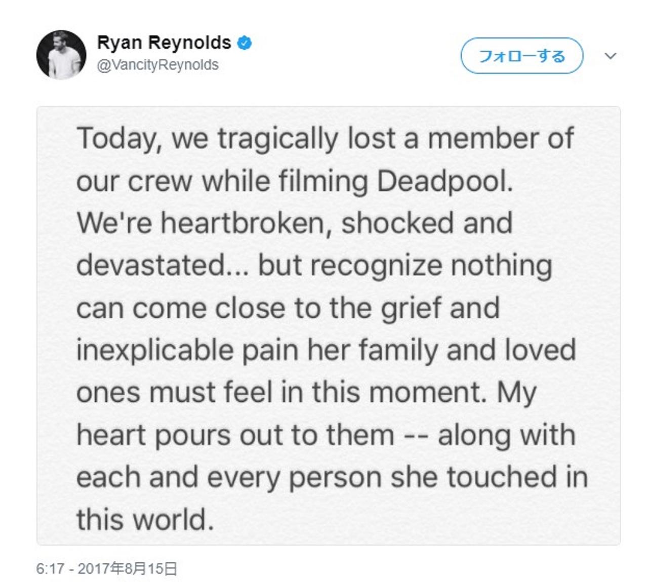 「今日私たちは『デッドプール』の撮影中にクルーの1人を亡くすという悲劇に見舞われました。私たちの心は打ち砕かれ、ショックに打ちのめされています。しかし、彼女の愛する人や家族が今この瞬間経験している深い悲しみや説明のしようがない痛みは、比べものにならないほどのものだということを理解しています。家族のみなさんと彼女がこの世界でふれあったすべての人々に全身全霊を注ぎます」