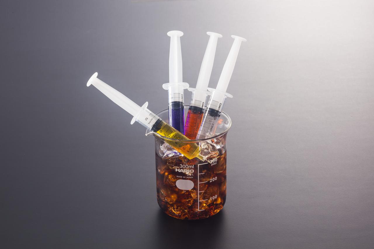 「新薬モニター」 注射器の中身はジン・ウォッカ・ラム・テキーラ。