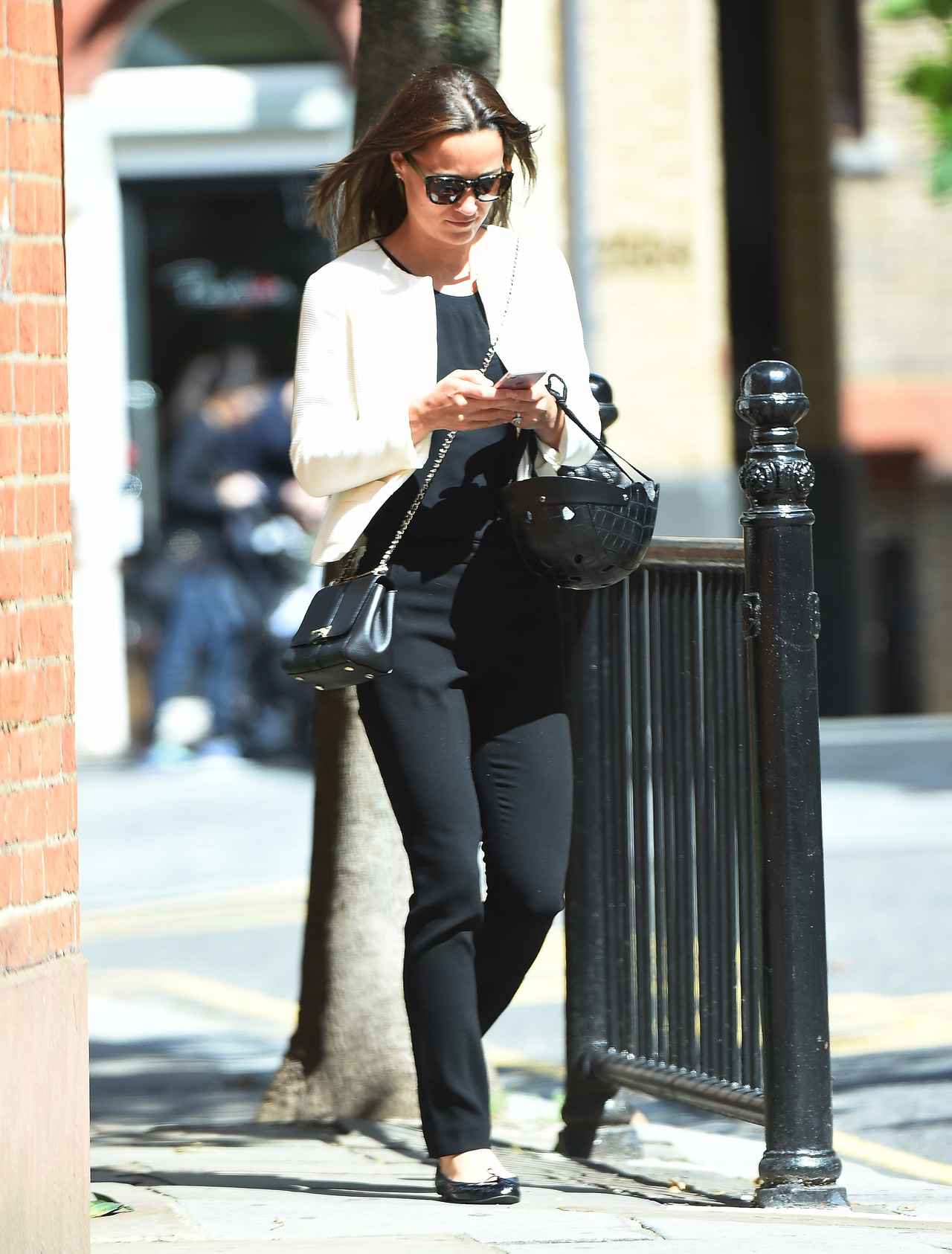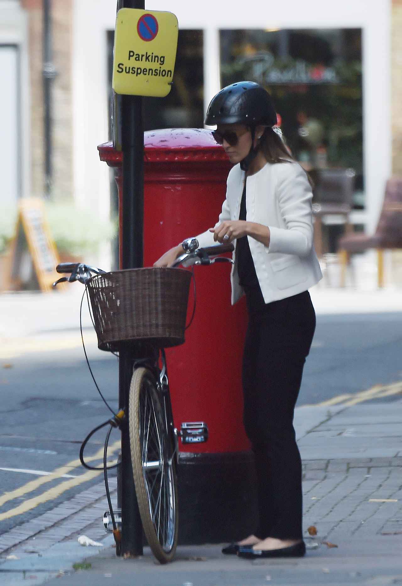 この日は、白のジャケットに黒デニム、バレエシューズというシックなラフスタイルでまとめたピッパ。ヘルメットも黒を選んで全てモノクロで統一しているのが彼女らしい。