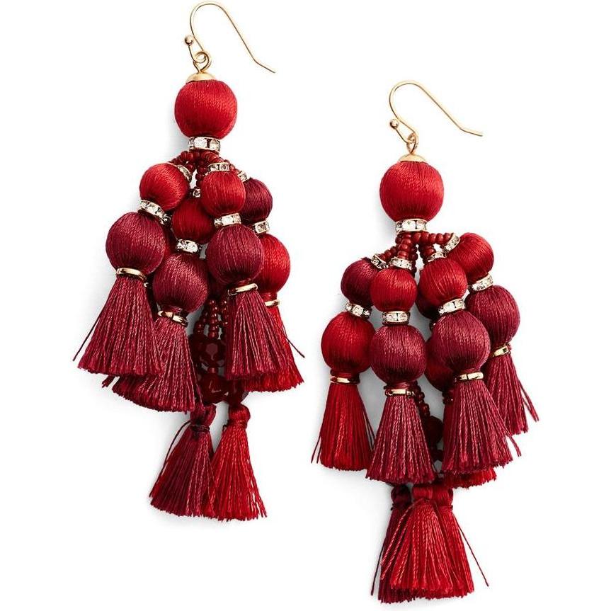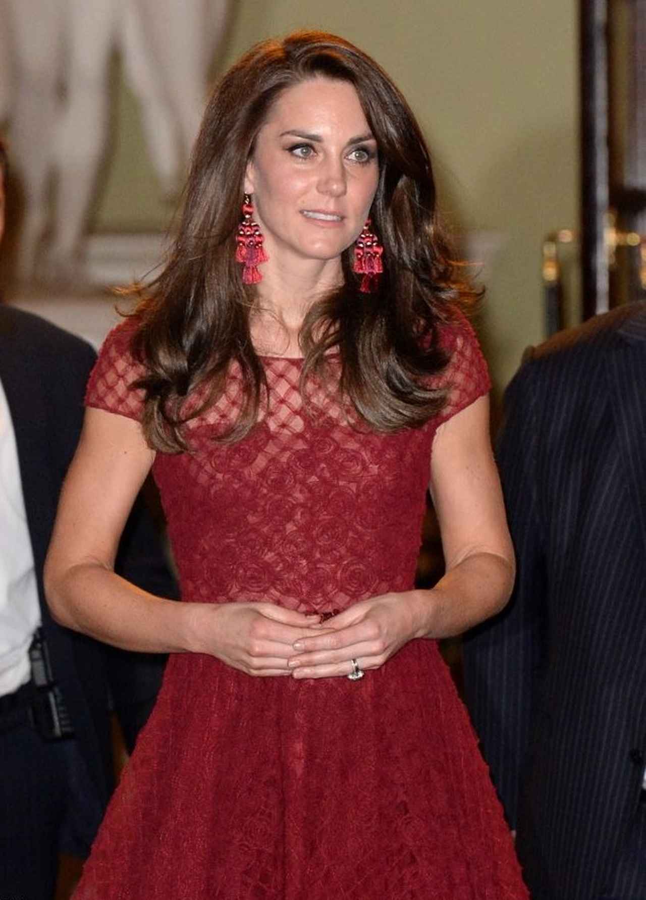 全身レッド系でまとめたスタイリングがエレガントなおしゃれなプリンセス、キャサリン妃もフリンジ・ピアスを愛用。イベントに参加したときにKate Spadeのタッセル・ピアスを選び、そのスタイルが好評だった。