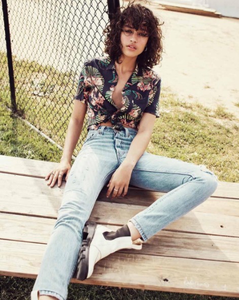 ARE YOU AM Iのショート丈トップスと太めでハードなダメージが入った90年代風デニムで、カーヴィーなくびれを見せたモデルのベラ。