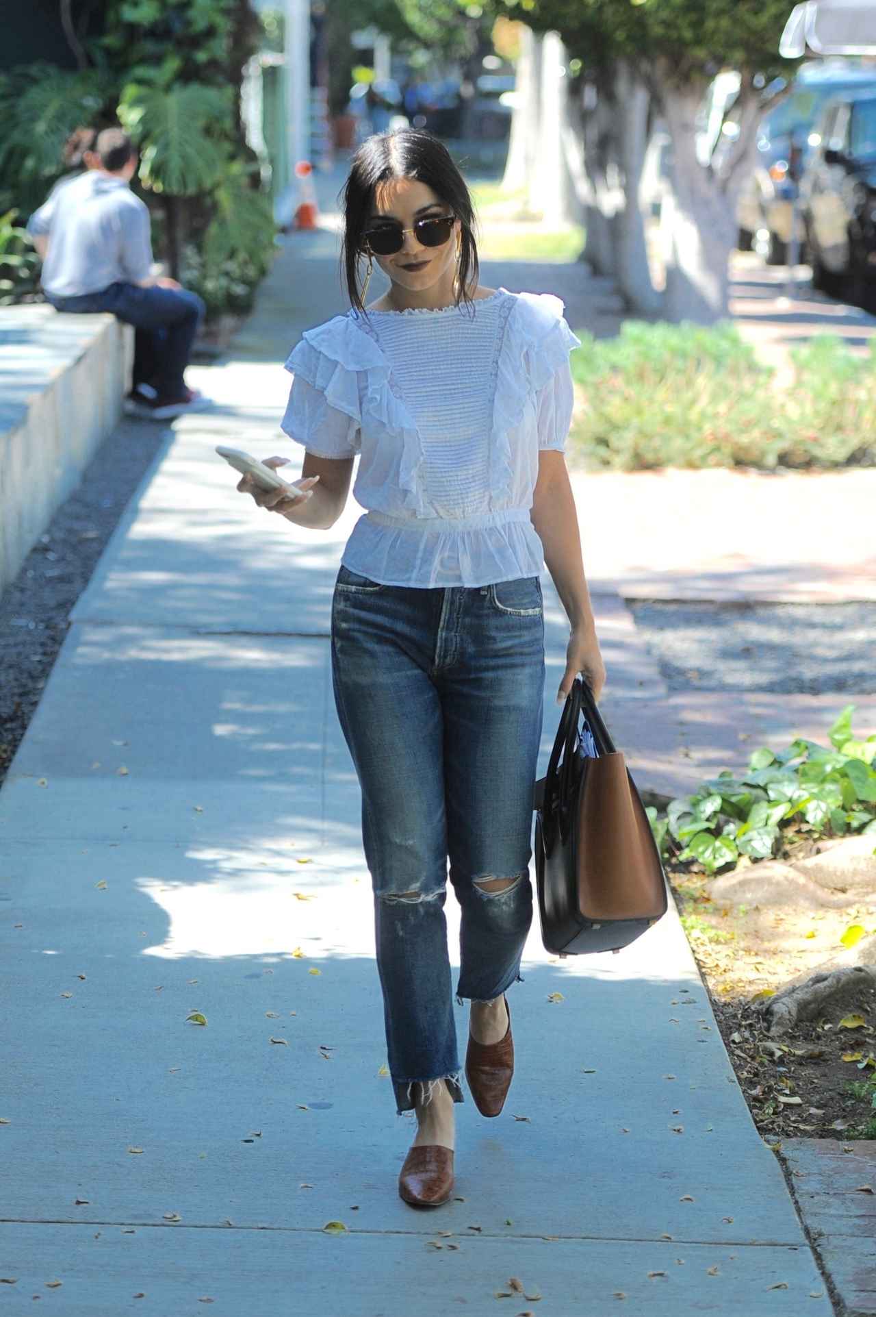 トレンドの甘いラッフルトップスには、裾が切りっぱなしのミッドウォッシュ加工されたニースラッシュデニムが相性抜群。バッグはCÉLINE。