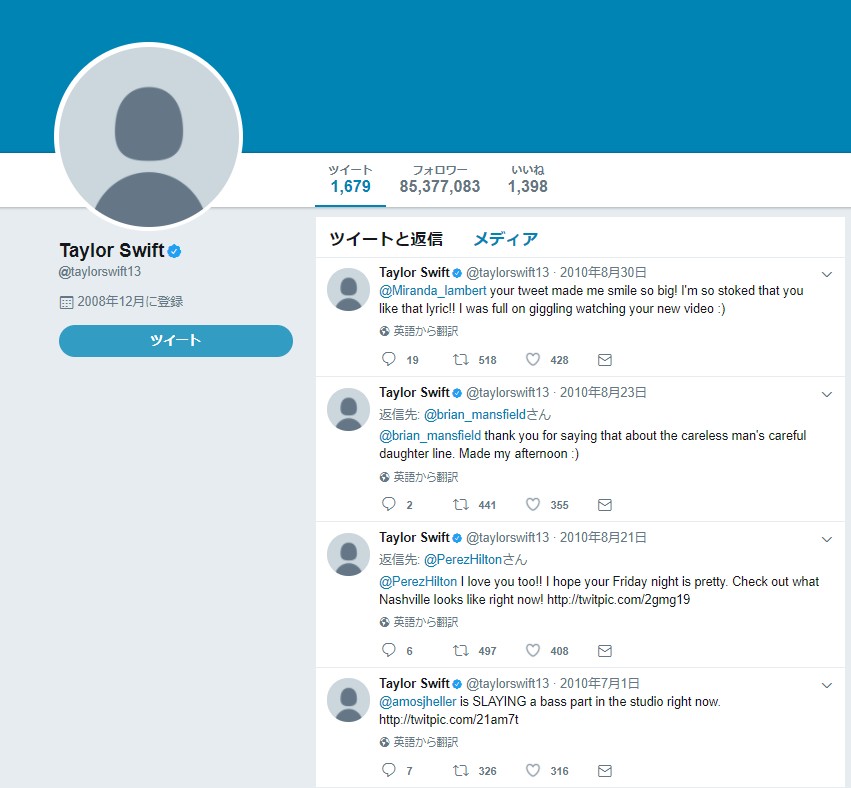 ツイッターは、アイコン&カバー写真が削除されデフォルトの状態に。過去ツイートは2010年8月以前のものしか残っていない。