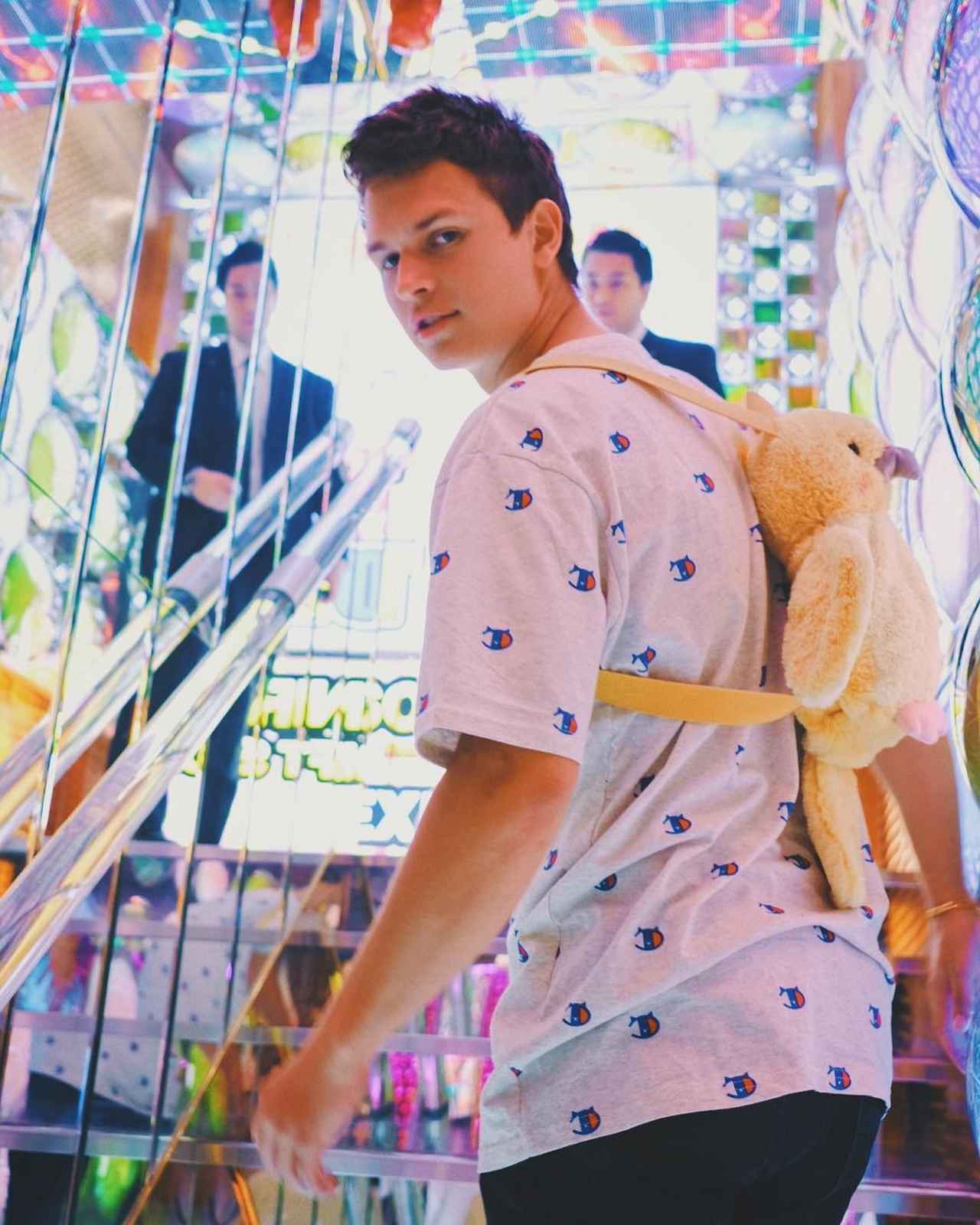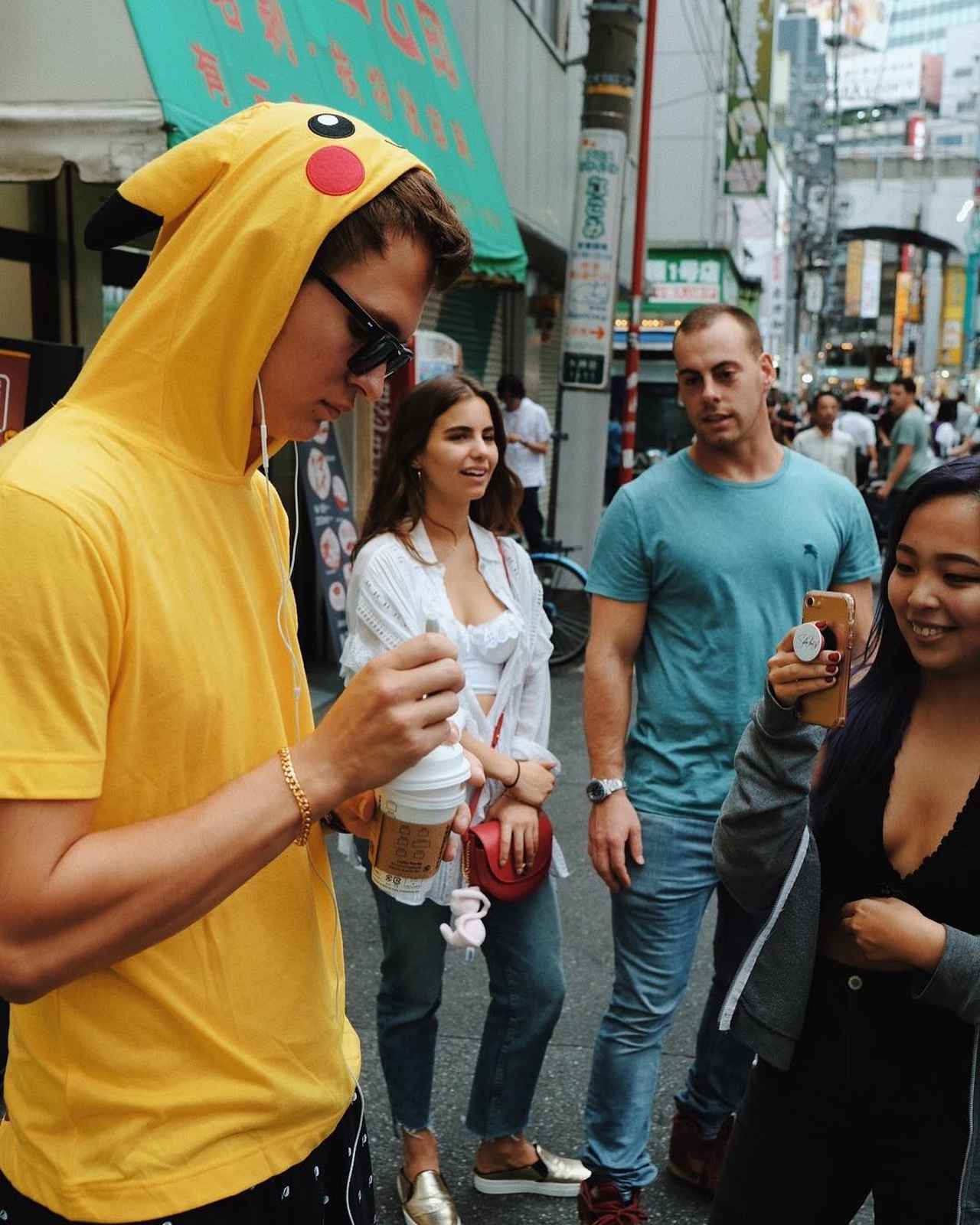 現在、来日中の人気若手俳優のアンセル・エルゴートが、ピカチュウの着ぐるみを着てガールフレンドらと秋葉原でショッピング。