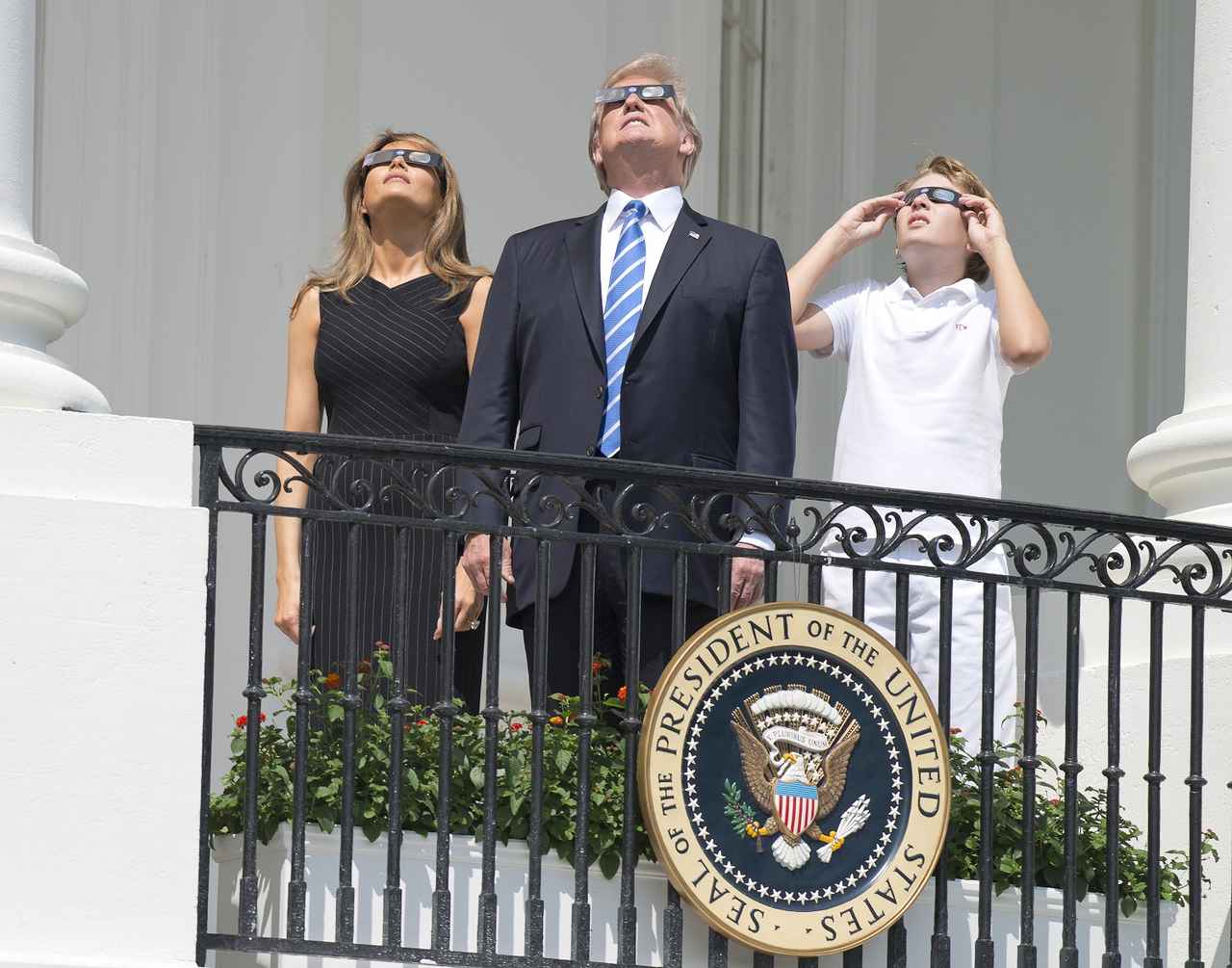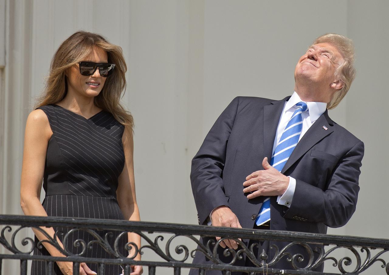 NASAが開発した日食鑑賞用の特殊な減光メガネを装着して楽しむメラニア夫人に対し、太陽を見上げてしまうトランプ大統領。